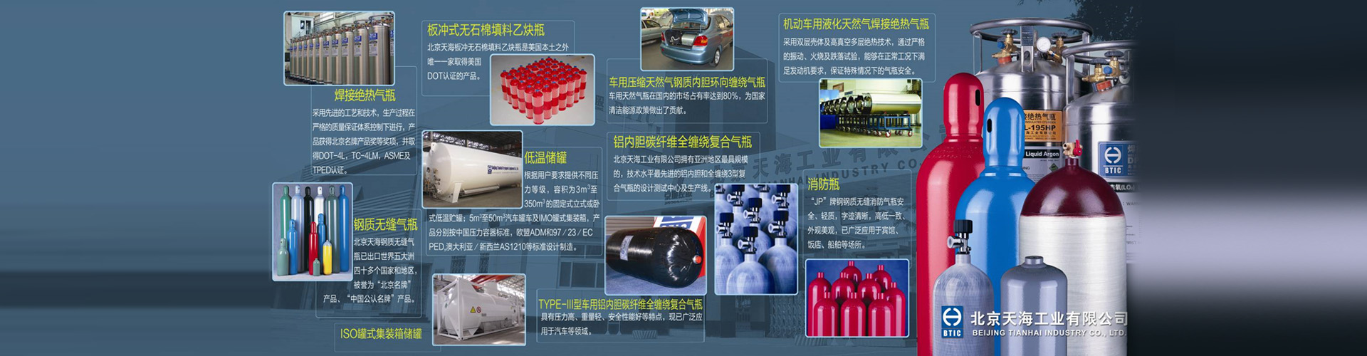 北京天海工業(yè)有限公司(以下簡稱“天海工業(yè)”)是北京京城機(jī)電控股有限責(zé)任公司所屬北京京城機(jī)電股份有限公司(簡稱京城股份,H股證券代碼00187,A股證券代碼600860)主要骨干企業(yè),是擁有七個(gè)專業(yè)氣體儲(chǔ)運(yùn)裝備生產(chǎn)基地(天海氫能、上海天海、天津天海、寬城天海、明暉天海、天海低溫、江蘇天海)及一個(gè)美國公司的集團(tuán)公司。天海工業(yè)及下屬子公司具有A2級(jí)高壓容器、B1級(jí)無縫氣瓶、B2級(jí)焊接氣瓶、B3級(jí)纖維纏繞氣瓶、B4級(jí)低溫絕熱氣瓶、B5級(jí)溶解乙炔氣瓶、C2級(jí)罐式集裝箱、D級(jí)中低壓容器的設(shè)計(jì)和生產(chǎn)資質(zhì)。可生產(chǎn)800余個(gè)品種規(guī)格的鋼質(zhì)無縫氣瓶、玻璃纖維環(huán)向纏繞氣瓶、碳纖維全纏繞復(fù)合氣瓶(含三型瓶、四型瓶、呼吸器)、無石棉填料乙炔瓶、焊接氣瓶、焊接絕熱氣瓶(含車用)、固定式壓力容器、低溫罐式集裝箱、船用罐、CNG/LNG/H2車載供氣系統(tǒng)及加氣站等系列產(chǎn)品,廣泛應(yīng)用于汽車、化工、消防、醫(yī)療、石油、能源、城建、食品、冶金、機(jī)械、電子等行業(yè)。